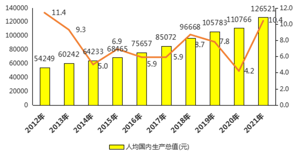 十年间,随着经济的持续发展,鲤城人均地区生产总值稳步提升。2021年,人均地区生产总值达到126521元,是2012年的2.33倍,是2017年的1.49倍,是全国(80976元)的1.56倍,2013-2021年年均增长7.1%。按年平均汇率折合1.96万美元。按照世界银行制定的国家与地区收入水平划分标准,鲤城已达到中等偏上、接近高收入国家或地区水平。居民收入得到明显改善。2021年,全区城镇居民人均可支配收入为53224元,达到2012年的1.52倍,2013-2021年年均增长6.2%;城镇居民人均消费支出32685元,是2012年的1.29倍,2013-2021年年均增长5.5%。