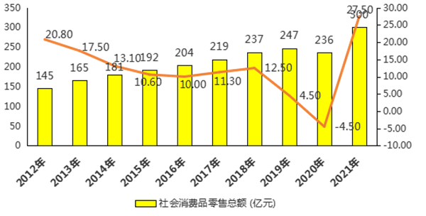 2012年以来,鲤城区消费品市场繁荣兴旺,总量逐步扩大。全区社会消费品零售总额由2012年的144.97亿元提高至2021年的300.32亿元,2016年突破200亿元,2021年突破300亿元,是2012年的2.07倍,2013-2021年年均增长11.1%。商业空间布局进一步完善,开始呈现由中心城区向周边,尤其是古城向新区的进一步延伸扩展。老城区商圈一体化形成,新城区市场集群化初具规模。目前共有5大专业市场,7大特色商业街,7家大型商超,3家大型商业综合体。市场建设由简易式向规模化、高档次、多功能发展,影响力、辐射力显著增加。特色商业街南环路汽车贸易走廊“虹吸”效应明显,2021年限额以上汽车零售额达141.98亿元,比2012年增加85.77亿元,2013 -2021年年均增长10.8%。