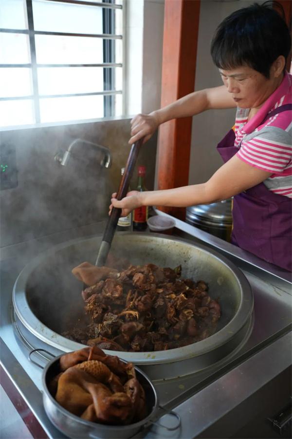 “我家的配料比较简单,和别人家不一样的地方在加了自家酿制的葡萄酒和德化茶油下去焖煮,高端的食材,往往只需要最简单的烹饪。”傅宝真一边翻炒着锅里的羊肉,一边乐呵呵说道。由于现在的店面没有空间堂食,她家只接受打包带走。“要是换成从前可以堂食,立冬这两天烹煮三四十头的羊都不够卖咧。”