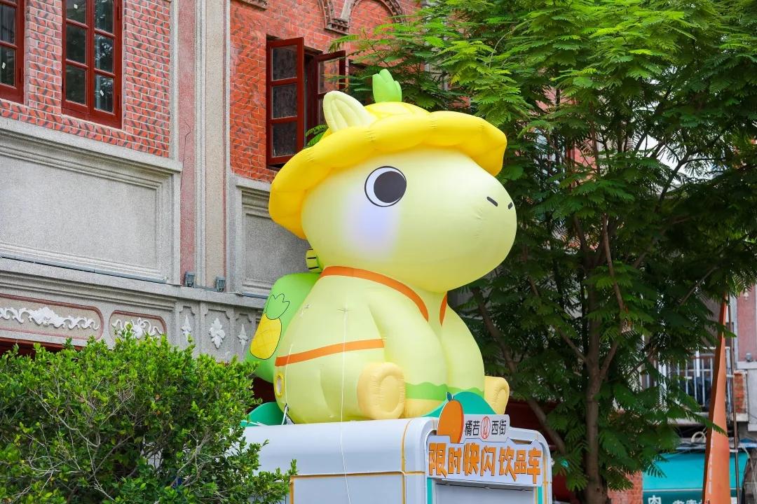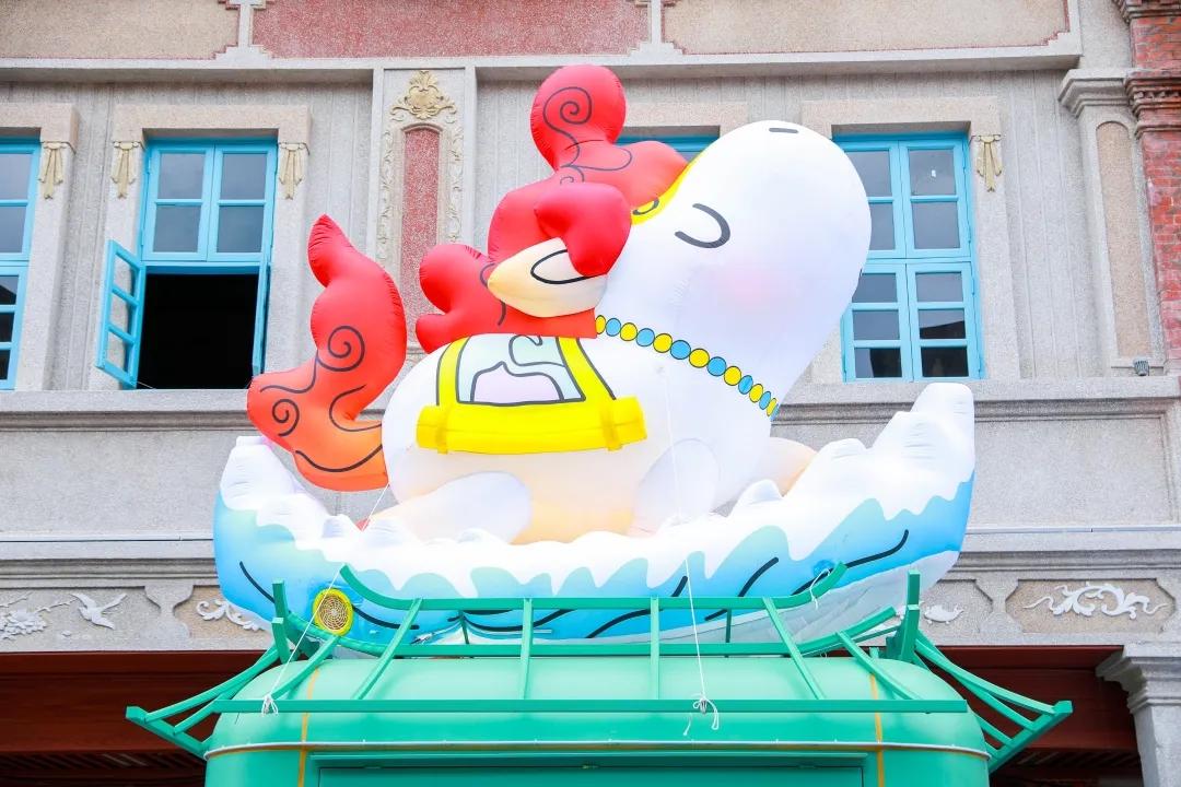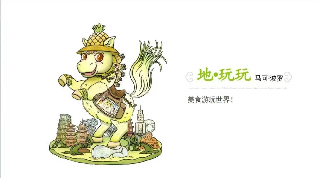 地·玩玩灵感源自旅行家马可·波罗,以绿色为主调,头戴渔夫帽,身背户外包,周身覆盖绿植,前蹄扬起,呈蓄势待发之态,俨然一副户外探险家形象。其底座则融入《马可·波罗游记》中出现的比萨斜塔、泉州东西塔、老君岩、钟楼等地标建筑。其设计理念为“种草万物、探索美景”,与马可·波罗的探险精神相契合,传递着不断前行、勇于开拓的精神。值得一提的是,其头上的菠萝帽既是马可·波罗名字的谐音,也借闽南语“旺来”寄寓美好期许。