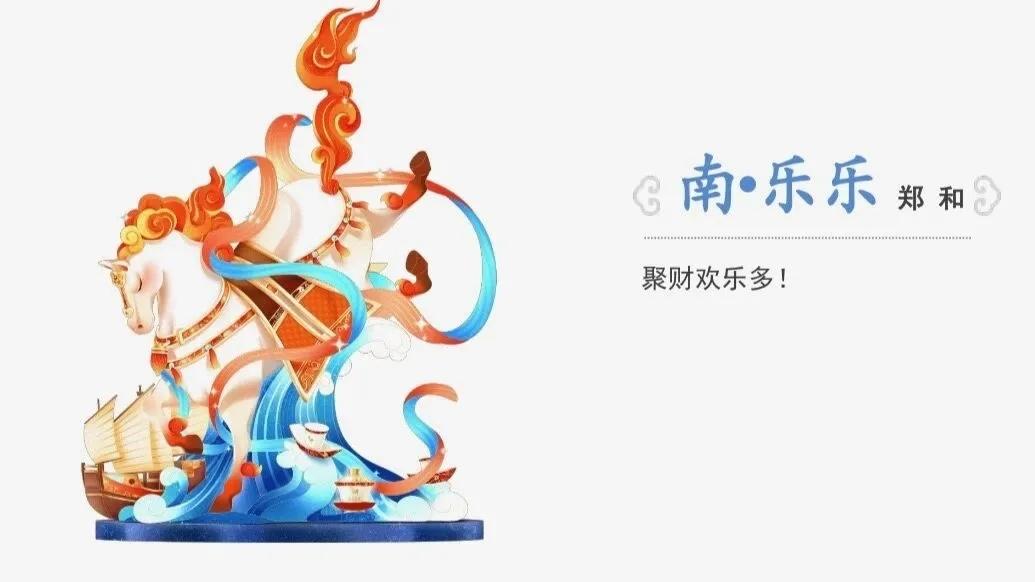 南·乐乐以郑和的故事为原型,其通体雪白、身姿灵动,身披彩缎。前额佩“如意”,尾部造型飘逸,有云雾缭绕之感;脚踏海浪,旁置郑和宝船,彰显泉州海丝文化特色。乐乐象征“文明与繁盛”,既含郑和下西洋促进文明互鉴的交流之乐,也寓意着泉州海丝贸易聚四方之财,让百姓乐享文明富庶生活。