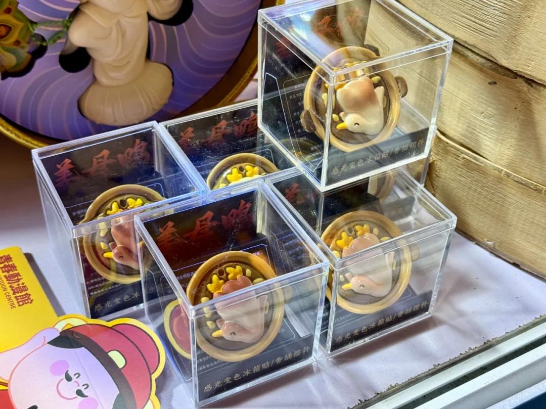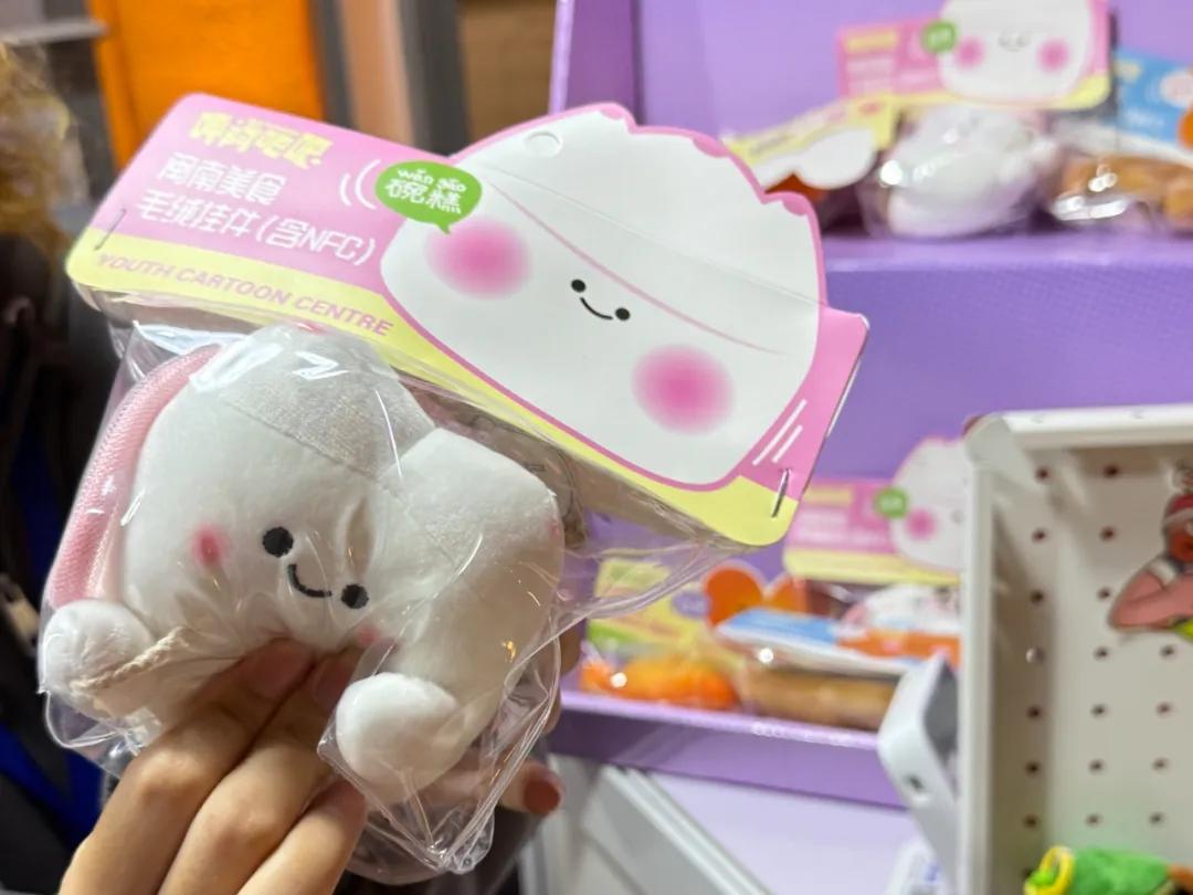 在青春动漫馆展位,闽南人早餐桌上熟悉的食物碗糕与油条,化身为Jellycat风格的毛绒玩偶,圆润的碗糕顶着开花造型,仿佛还在冒着热气;金黄的油条弯出俏皮弧度,似乎在等人品鉴它的酥脆。“我们是泉州本土企业,一直致力于开发具有地方特色的文创产品。”工作人员介绍,他们以泉州美食为灵感开发的系列文创,除了碗糕和油条,还有一款以姜母鸭为原型的文创产品,“它不仅是可随光线变色的冰箱贴,也可作为香插摆件,兼具可爱外观与实用功能。”