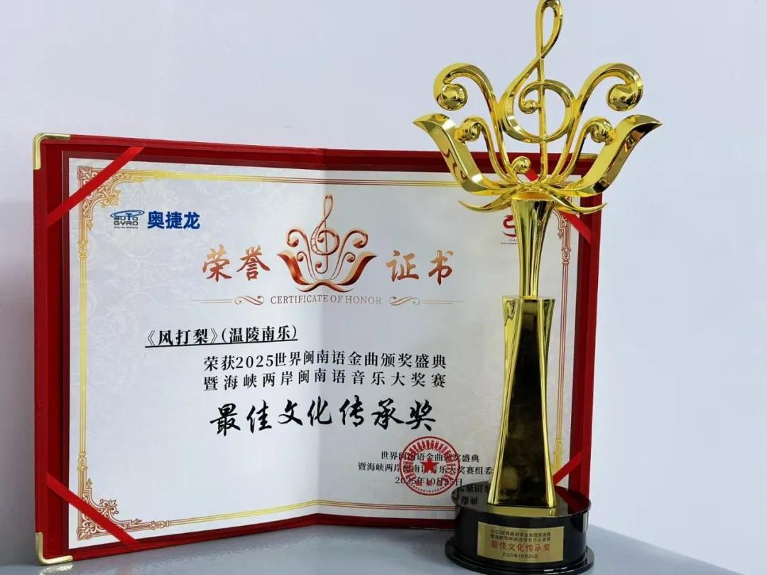 近日,由鲤城文投集团与印记闽南文旅联合组建的温陵南乐乐团凭借南音作品《风打梨》,在2025世界闽南语金曲颁奖盛典暨海峡两岸闽南语音乐大奖赛中,成功摘得“最佳文化传承奖”。