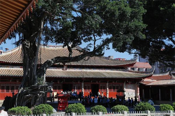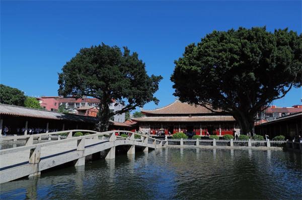 站在泮池边放眼望去,两株百年榕树枝干舒展、线条分明,与身后的大成殿共同组成一幅生动的立体画卷。