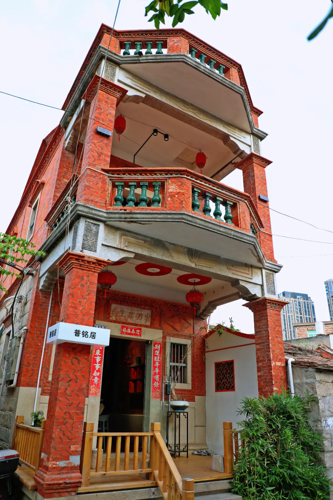 紧邻茶馆的“普铭居”,是一座始建于19世纪50年代的独栋番仔楼,总面积约200平方米。侨亲林思明早年远赴菲律宾经营布行,并汇款回乡修建此楼以安置家人。历经岁月流转,这栋建筑由高山社区居民林伟民承租并投入修缮,转型为融合设计工作室与茶室功能的复合空间。