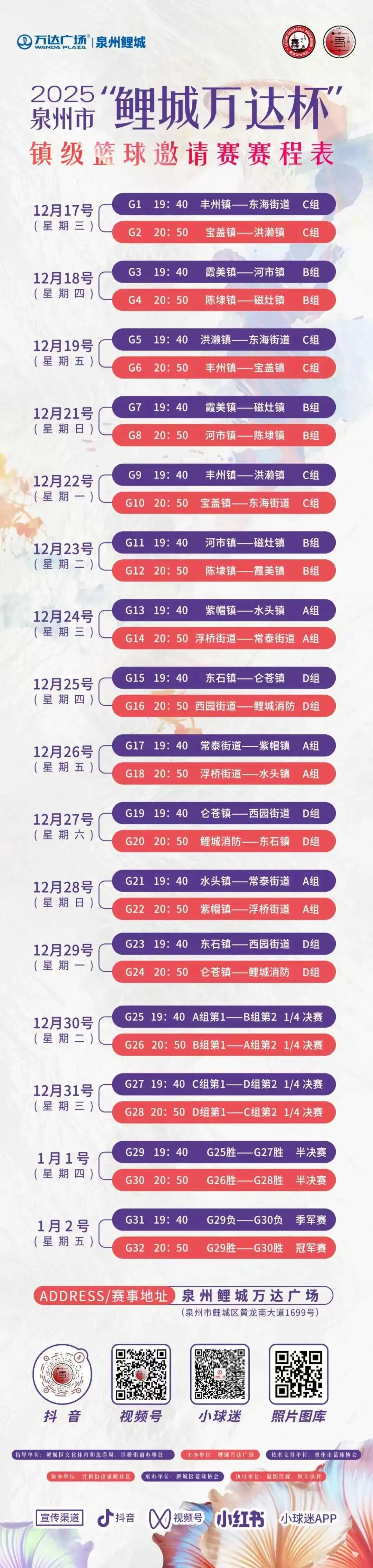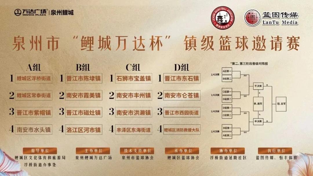 据悉,本次赛事由鲤城区文旅局、浮桥街道办事处指导,鲤城万达广场主办,将严格采用中国篮球协会审定的最新篮球竞赛规则。16支参赛队伍将分为A、B、C、D四个小组,第一阶段进行组内单循环赛,第二阶段起采用交叉淘汰制,最终决出冠、亚、季、殿军。