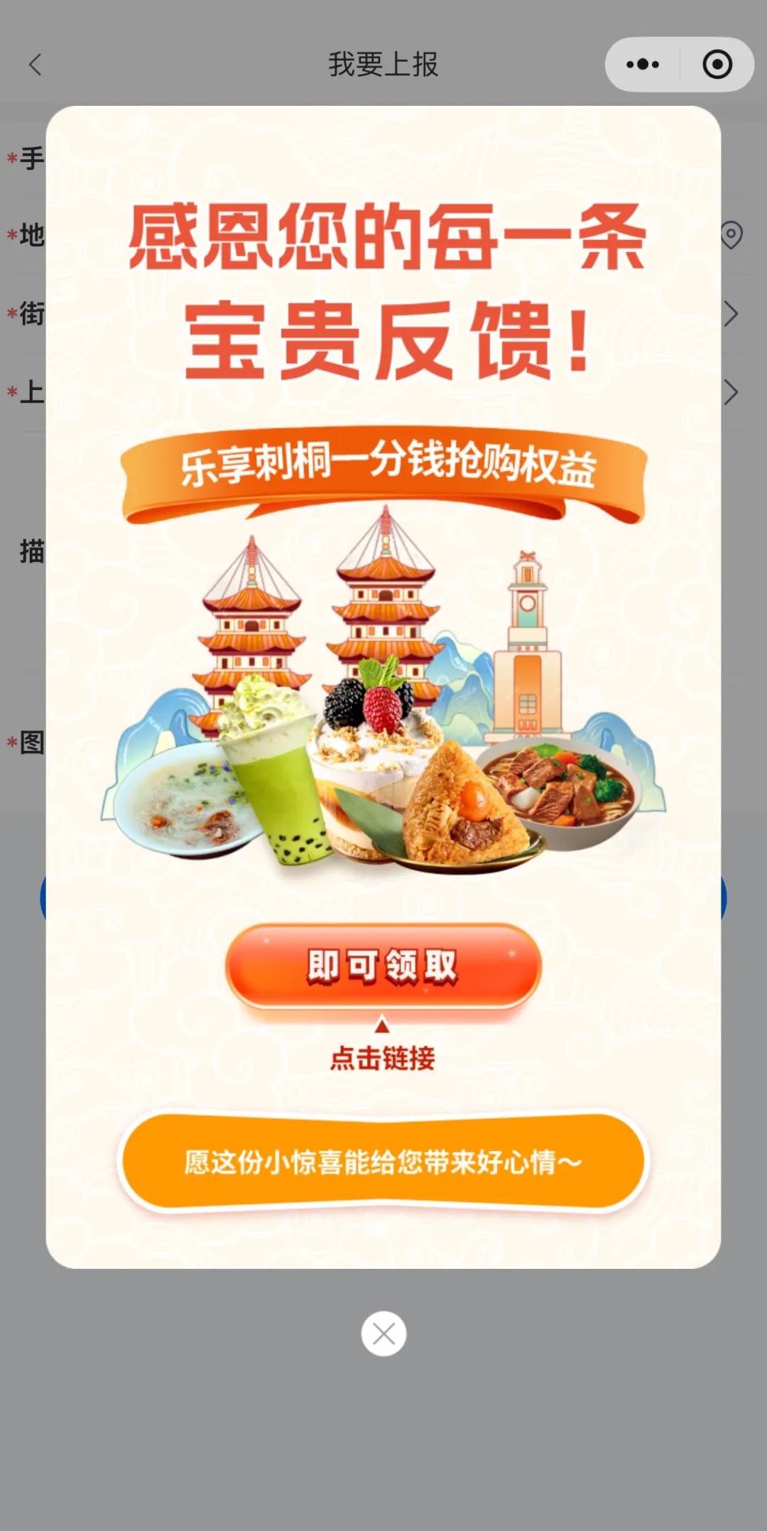 为激发市民参与城市治理的积极性,即日起,鲤城区数字化治理平台“鲤便民”小程序推出“一分钱抢购权益”活动。市民群众通过小程序上报身边的环境卫生、公共秩序、市容市貌等问题后,即可获得参与资格,以0.01元抢购涵盖美食、文创等多类商品。