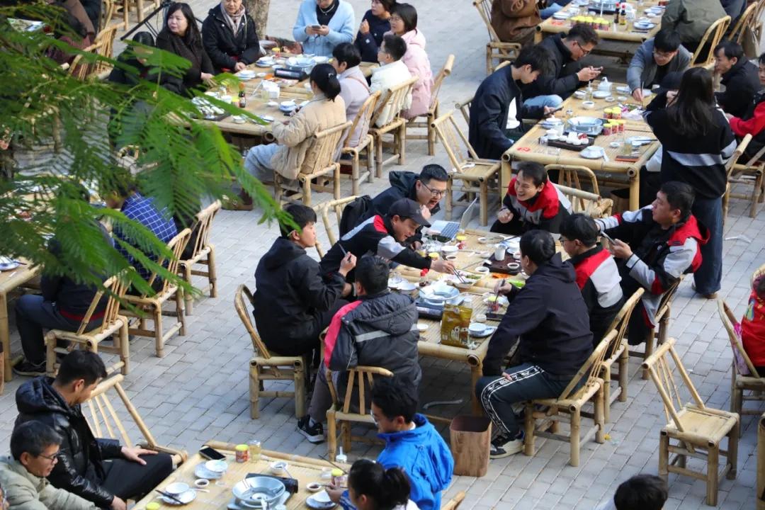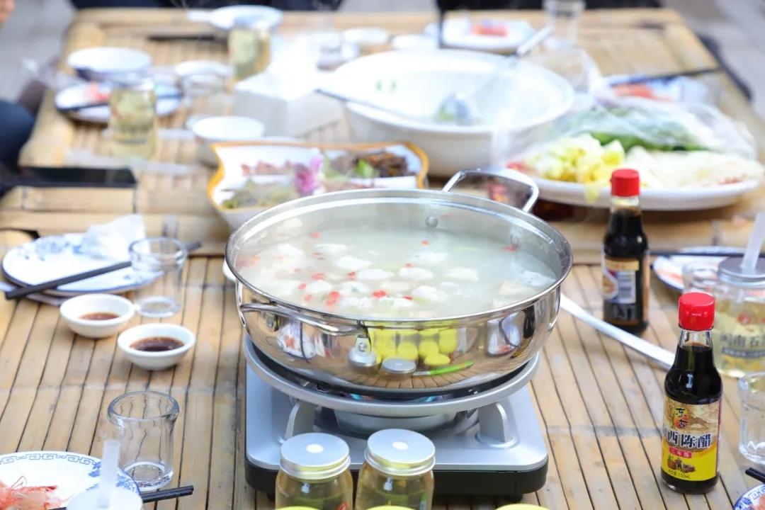 活动现场张灯结彩,年味十足。20桌宴席依次排开,近200人围桌而坐,场面喜庆热闹。为凸显地道闽南风情,宴席主打特色围炉“软锅烧”(火锅),炉火正旺,锅中暖汤翻滚,蒸腾的热气瞬间烘托出团圆的温暖。