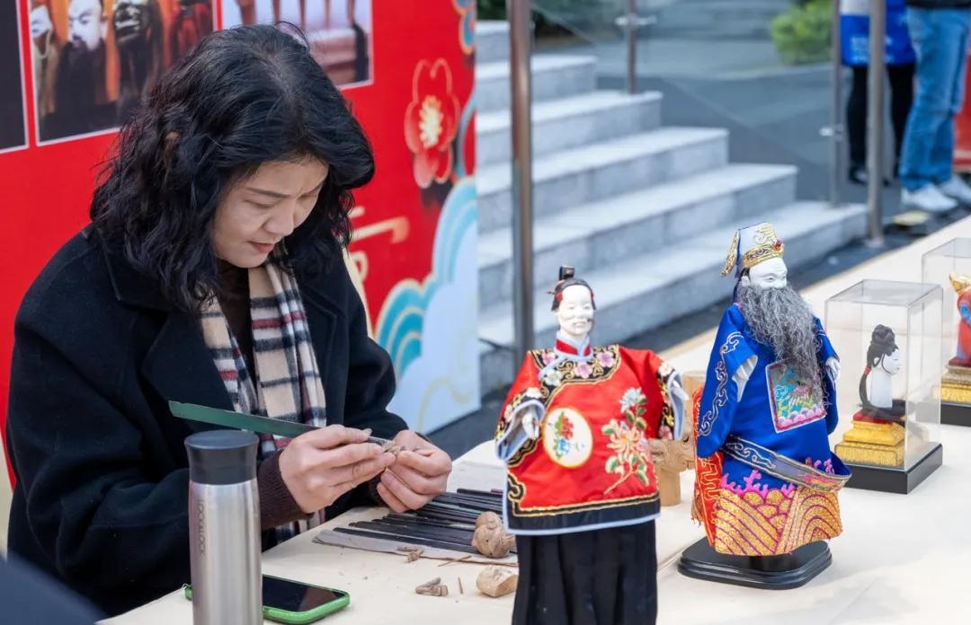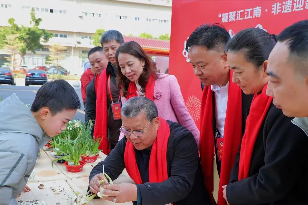 活动现场特别设置了互动体验区与非遗集市。在“新鲤城人”新春工坊互动体验区,区政协委员庄崇宏与书法家们挥毫泼墨,共同写春联、送福字;区政协老委员联谊会副会长、农艺高级技师苏剑沙指导参与者雕刻水仙花球;非遗传承人曹淑贞、黄紫燕分别带领群众体验剪纸、纸扎、木偶头雕刻等非遗技艺;区政协委员、制茶高级工程师黄永红则展示交流茶艺。