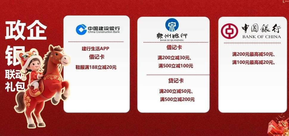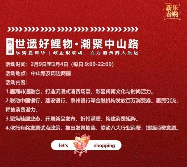 随后,鲤城区正式启动2026“世遗好鲤物·潮聚中山路”乐购嘉年华,联动银联、泉州银行、建设银行、中国银行等机构推出多档专属满减政策,配套主街各大国潮品牌商户同步开展配套折扣、满赠、新品体验等活动,串联跨年、迎新、春节三大节点,打造覆盖线上线下、融合文商旅、贯通全域的“福气满满的消费新年”。2月9日起至3月4日,可享受最高满减200元购物叠加优惠。