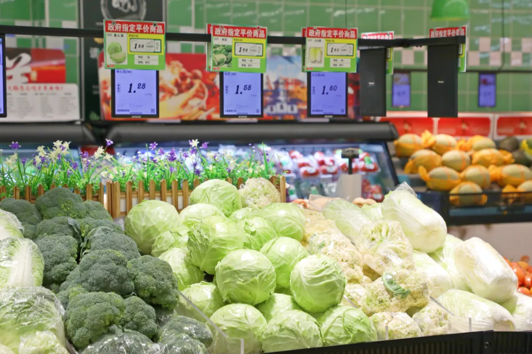在平价商品专营区内,记者看到货架上陈列着大白菜、菜花、西红柿、黄瓜等10种蔬菜,以及鸡蛋、米、调和油等品类。每种商品均配有统一的“平价商品”价格标签,与普通商品明确区分。据了解,本次平价商品涵盖粮、油、肉、蛋、蔬菜、水果等六大类共17个品种,销售价格均低于市场综合平均价,其中粮、油、肉、蛋、水果类价格下浮10%,蔬菜类价格下浮15%。