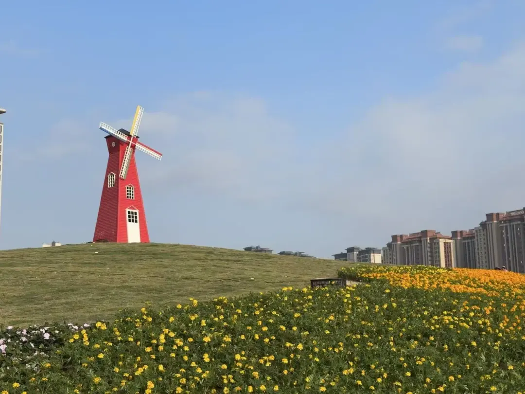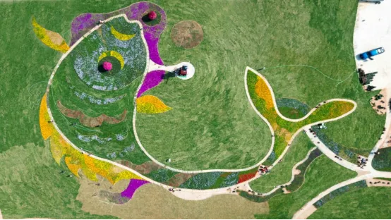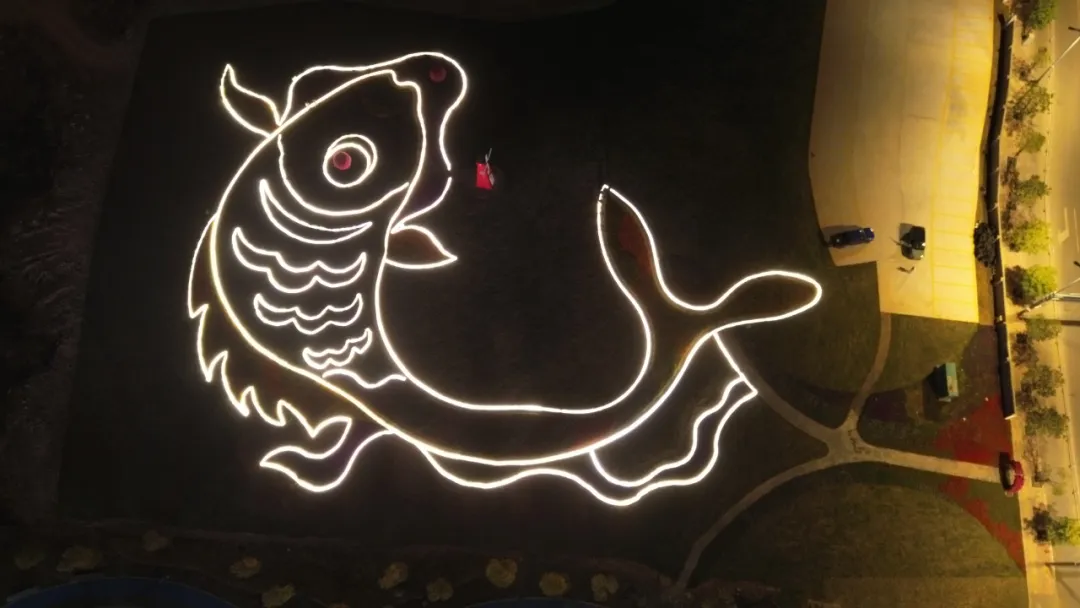 在鲤城万达广场旁,一方草坡被各色花卉层层叠叠铺满,粉紫黄白的花浪随风摇曳,漫步其间可见红风车伫立坡顶,与缤纷花海相映成趣。从高空俯瞰,这处花海宛若一条灵动的鲤鱼;夜幕降临,创意灯光次第亮起,光影勾勒出鲤鱼游弋的模样,将年味与浪漫拉满。