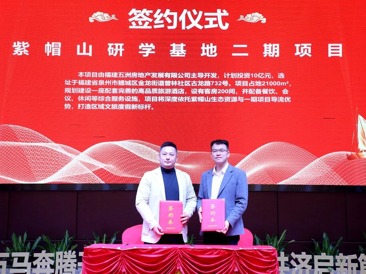 现场,泉州鸿星尔克增资扩产、笋江北路高端酒店、紫帽山研学基地二期、泉州市天峰服饰提质增效等4个项目集中签约,总投资50亿元,涵盖文旅经济、纺织服装等多个领域,为金龙街道新一年产业发展注入强劲动能。