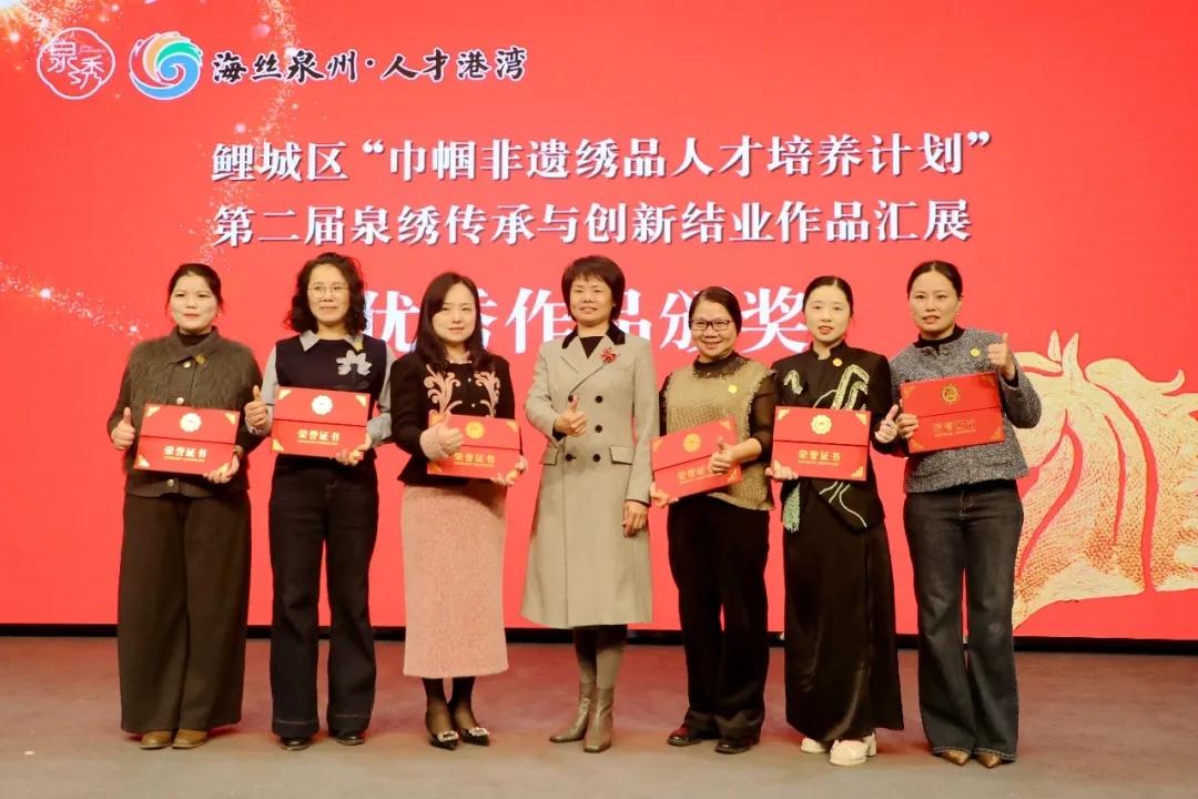 在优秀作品颁奖环节,《七彩丹凤》获评金奖作品,《紫气东来》《金麟献瑞》获评银奖作品,《金簪》《海的女儿》《泉南佛国》获评铜奖作品。这些作品经过授课老师、绣品专家、文化学者综合考评,充分展现了泉绣的艺术价值与传承人的创新能力。