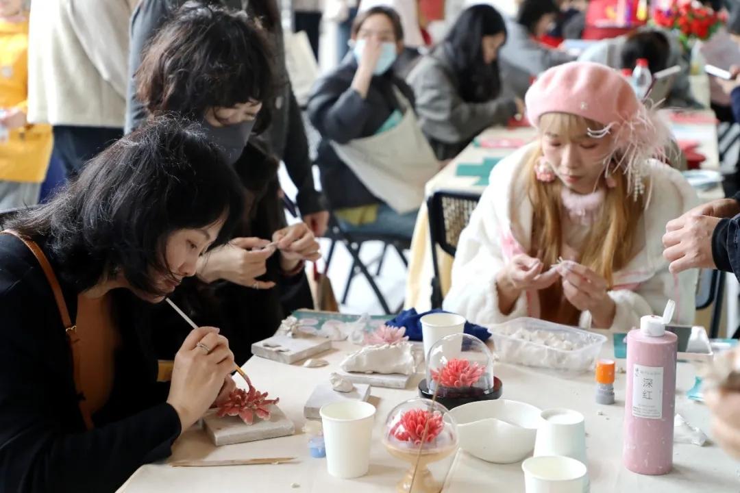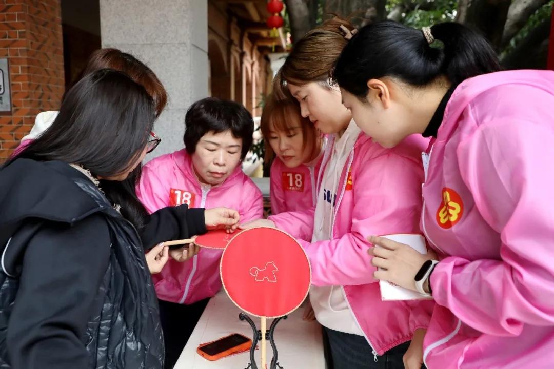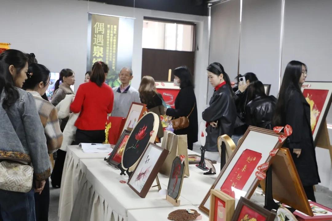 活动现场还设置了公众文化体验区,巾帼文创市集、政策咨询台、非遗手作体验、非遗成果静态展廊等点位有序分布,大家在各具特色的摊位间穿梭,挑选心仪的文创好物,有的则尝试金苍绣、刻纸等传统技艺,感受千年非遗的温度。一旁的趣味打卡抽盲盒活动同样人气高涨,大家满怀期待地抽取盲盒,惊喜的欢呼声此起彼伏,为活动增添了乐趣与活力。
