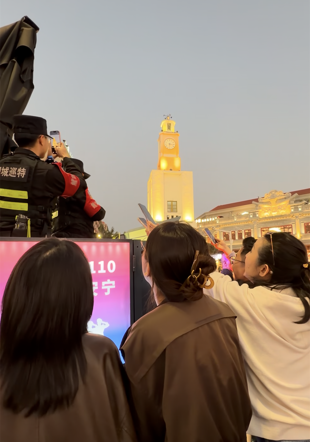 网友“香菜大王”也晒出了一张现场辅警帮忙拍摄的钟楼照片。照片里,夜色中的钟楼亮起暖黄色的灯光,柔光勾勒出钟楼的轮廓,灯影与街景交织,显得格外宁静而清晰。“香菜大王”告诉记者,自己是在外求学的泉州人,寒假到西街游玩时,看到不少人正在排队“求代拍”,便也递上手机让他们帮忙拍了一张,“警察小哥态度很好,拍的照片也很好看。”
