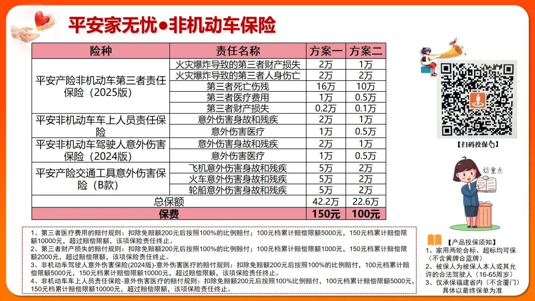 针对这一问题,在市保险协会、区委政法委、交警鲤城大队的联合指导下,平安财险、中华联合财险、阳光财险、亚太财险、华安财险、平安创展等6家机构,共同推出普惠型非机动车保险方案。该方案面向所有家用两轮电动车,超标车(不含黄牌和蓝牌)也可投保,被保险人及其允许的合法驾驶人(16-65周岁)均在保障范围内。