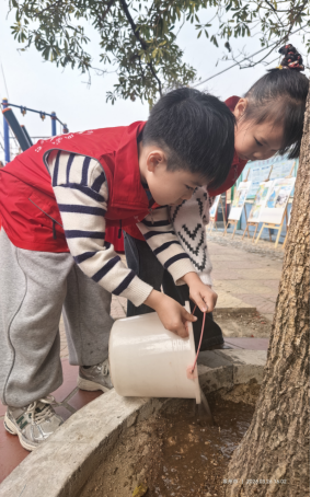 巡河队伍中,还有一群特别的身影——来自下店幼儿园的小小志愿者。他们拿着小抹布,认真擦洗公园里的石桌石椅,不放过任何一个角落。擦洗完桌椅,孩子们并没有把水倒掉,而是小心翼翼地端到旁边的树下,给小树浇水。“小树小树,你要快快长大,我们一起保护南高渠!”童真的话语里,藏着最朴素的环保理念——节约用水,从点滴做起。