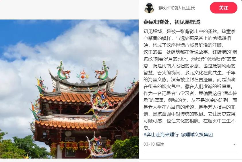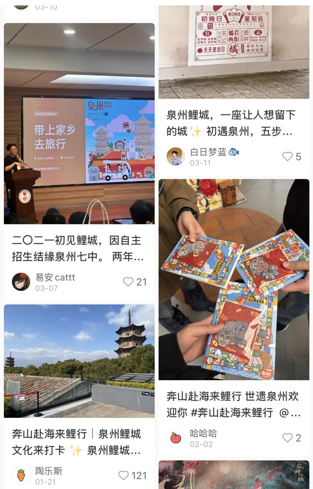 活动期间,来自各地的大学生纷纷在小红书发布原创图文,用镜头与文字记录下他们对鲤城的初见印象与未来期待。有的同学晒出在古城拍摄的燕尾脊照片,感慨“这里的每一处建筑都在诉说故事。”;也有同学晒出古城的美食和风景,感慨“初遇泉州,五步一寺庙,三步一烟火,生活气息扑面而来,未来如果有机会,也会想在这里工作,慢慢感受晨钟暮鼓和市井温情。”;更有同学向广大游客发出邀请,表示“这是一座活态传承、半城烟火半城仙的海丝名城,欢迎大家来泉州旅游!”。字里行间,尽是对家乡的热爱与自豪。