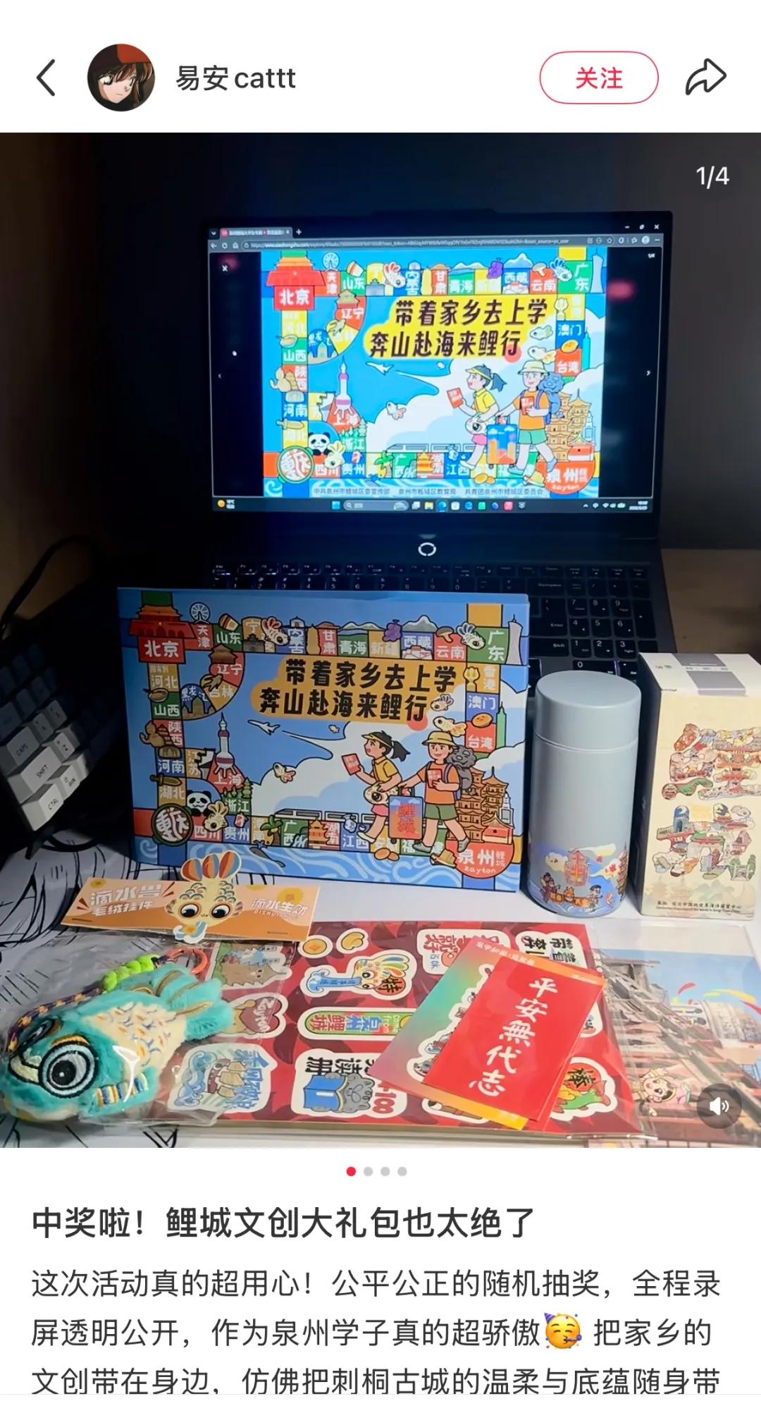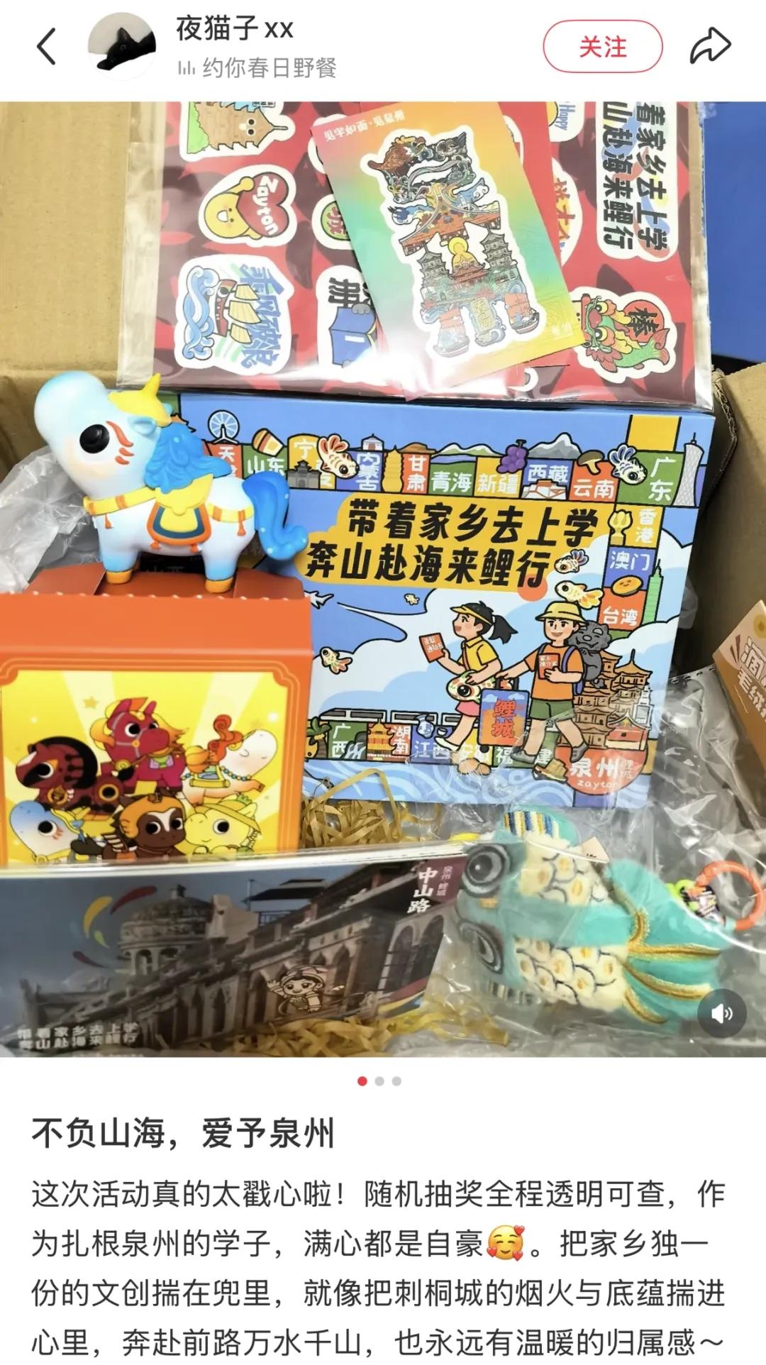 一幅幅创意打卡照片、一段段走心文字,让古老的文脉、建筑与非遗在鲜活的表达中被看见、被传播。同学们的每一份创意与热情,主办方都用心回应,特意准备了丰富的文创礼包,包含鲤城限定文创保温杯、鲤鲤鱼毛绒挂件、马年IP文创盲盒等。一份份满载鲤城心意的文创礼包,通过线上抽奖的方式送到了同学们手中。