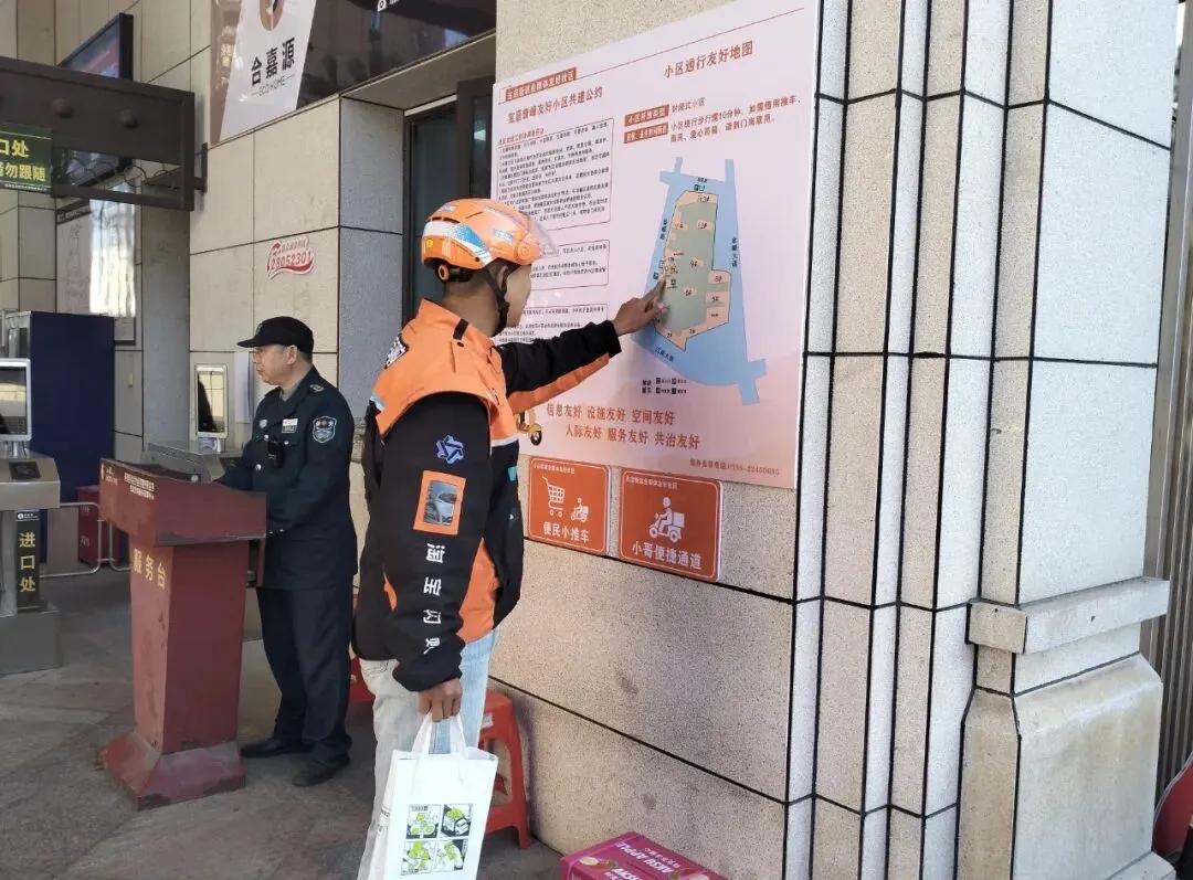 新就业群体与物业的摩擦也曾是“老大难”。外卖小哥、快递员为赶时间,停车时常占用小区通道,与保安发生口角的情况屡见不鲜。为此,社区联合物业在宝嘉誉峰小区划出专属停车位,设置“友好地图”和楼栋指引牌,还提供免费推车。如今,小哥们进小区顺畅了,心情也舒畅了,有些人还主动加入社区志愿服务队,在送餐途中顺手反馈安全隐患、卫生问题,成为社区管理的“流动哨兵”。