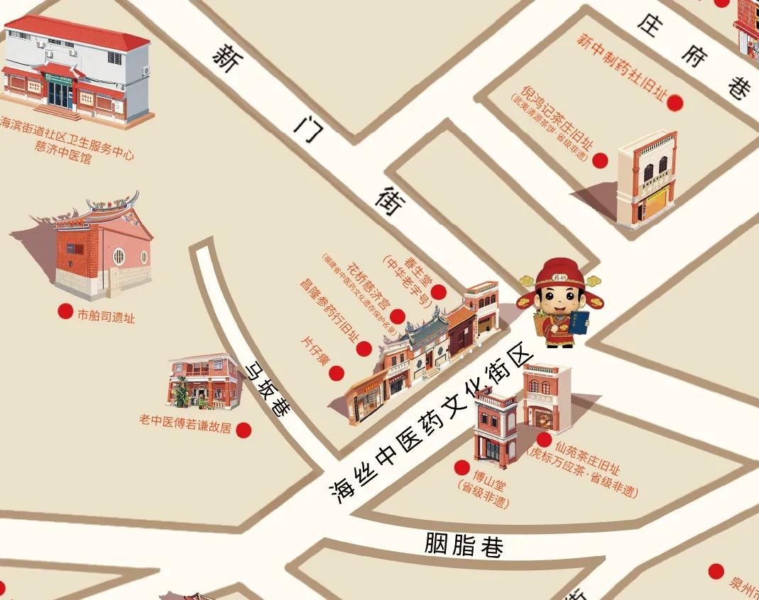 整张地图色调温暖雅致,以中山路为轴,覆盖泉州古城核心区域。东西塔、府文庙等地标清晰可辨,古城各处的中医医疗机构,以及散落于西街、中山路等街巷的老字号药铺等三十余处中医药文化节点,通过特色手绘建筑图标详细标注,与古城世遗点有机融合,为市民游客游览古城、寻访老药铺、体验中医服务、领略中医药文化底蕴提供清晰的点位指引。