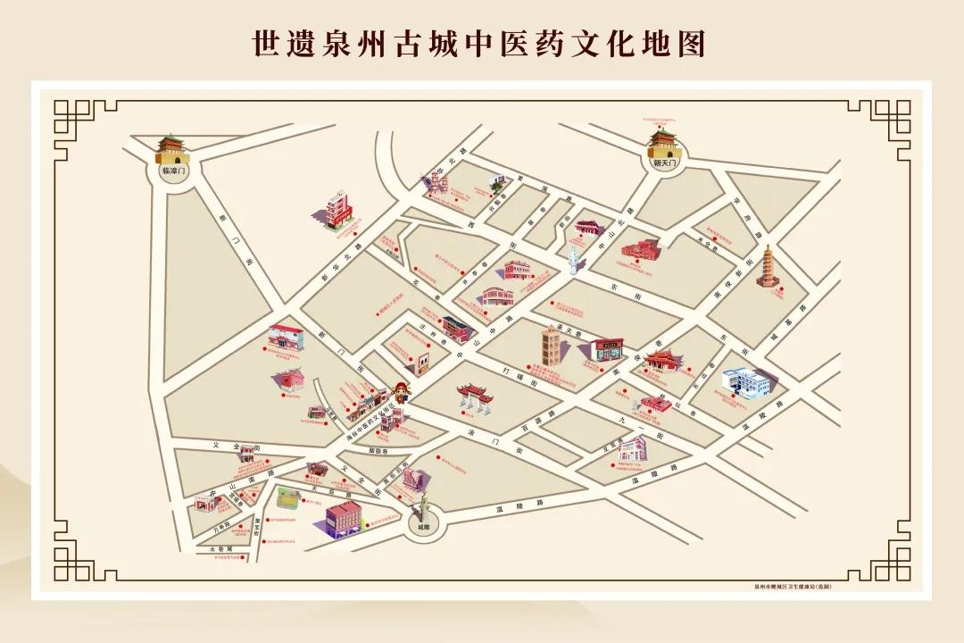 近日,由鲤城区卫健局牵头编制的全省首张“世遗泉州古城中医药文化地图”正式亮相。地图以手绘形式,将散落于古城街巷的中医药文化地标串珠成链,生动呈现“千年医脉”与“世遗古城”交相辉映的独特风貌,为市民和游客打开一扇了解中医药文化的全新窗口。