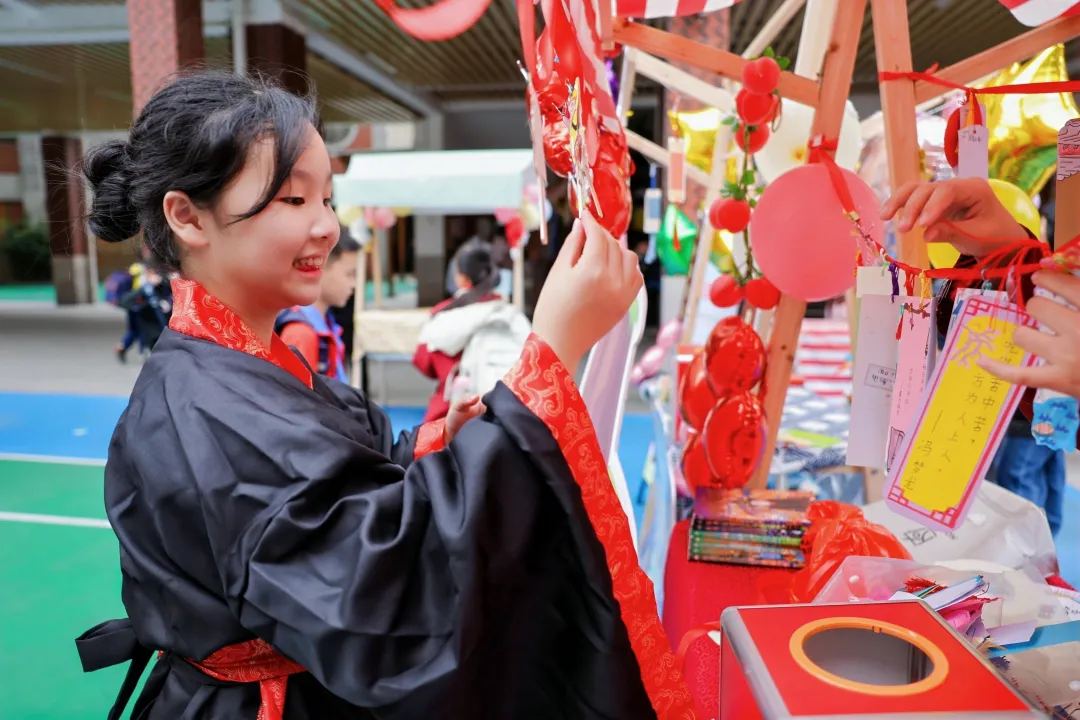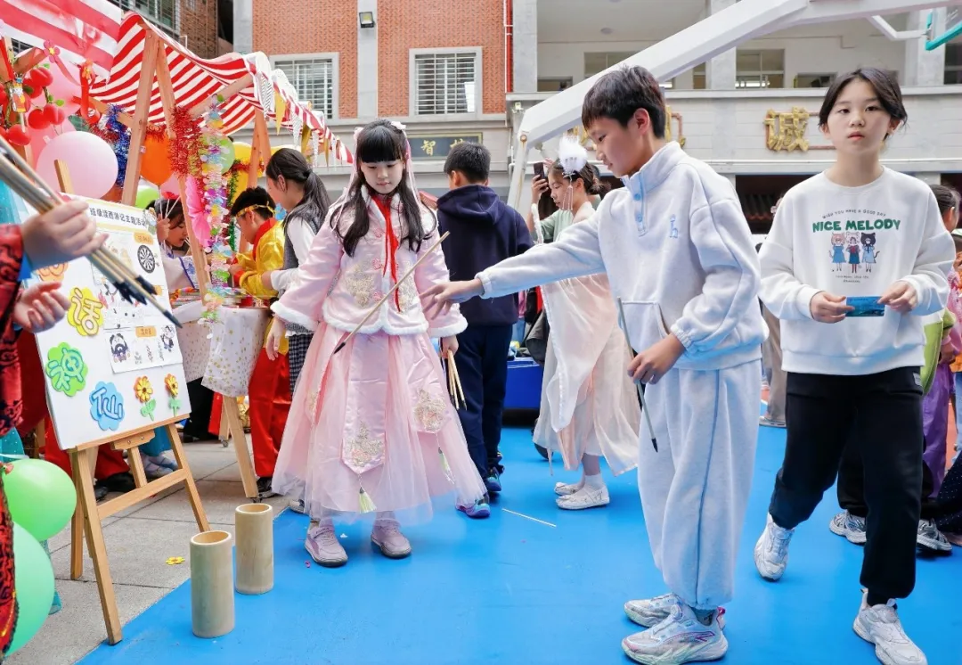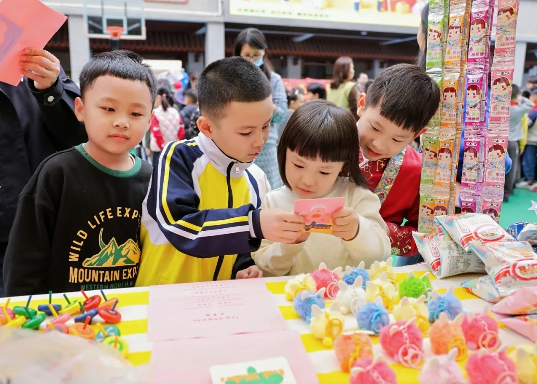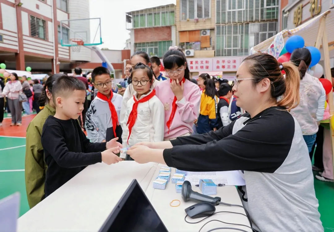 据介绍,此次图书市集结合各年段学生年龄特点,围绕童话、科幻、红色经典等主题打造特色摊位,由各班级自主设计摊位名称和游戏形式,并设置趣味游戏、角色扮演、书签DIY、活字印刷拓印等互动环节,让孩子们在人物扮演、闯关答题和情节表演中,亲身体会文学魅力,轻松积累阅读知识。