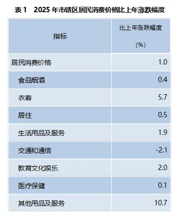 全年市辖区居民消费价格比上年上涨1.0%,其中,消费品价格上涨1.1%,服务项目价格上涨0.8%。