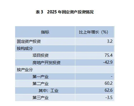 全年固定资产投资比上年增长3.2%。其中项目投资增长75.4%,占固定资产投资66.2%;房地产开发投资下降42.9%,占固定资产投资33.8%。