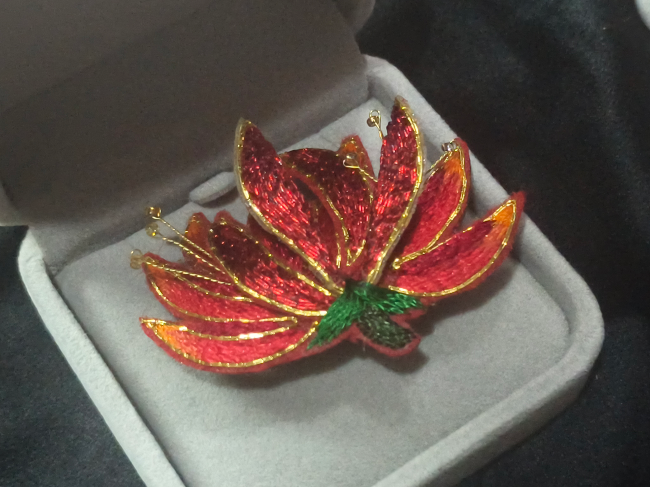 “真没想到,我绣的胸针有一天能被联合国总干事佩戴上。”这枚备受青睐的刺桐花胸针,正是出自金苍绣省级代表性传承人吴心治之手。她告诉记者,别看胸针不大,工艺却十分复杂,采用线绣、平绣、凸绣三种针法层层绣制,使得花瓣饱满立体,生动还原刺桐“红花似火”的热烈姿态。